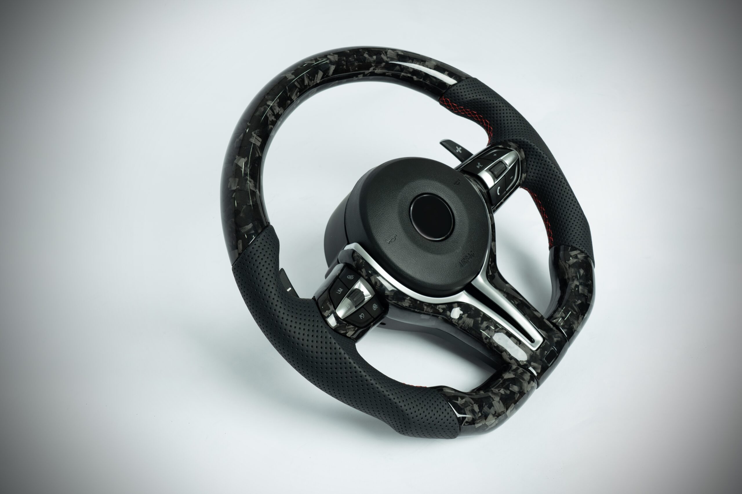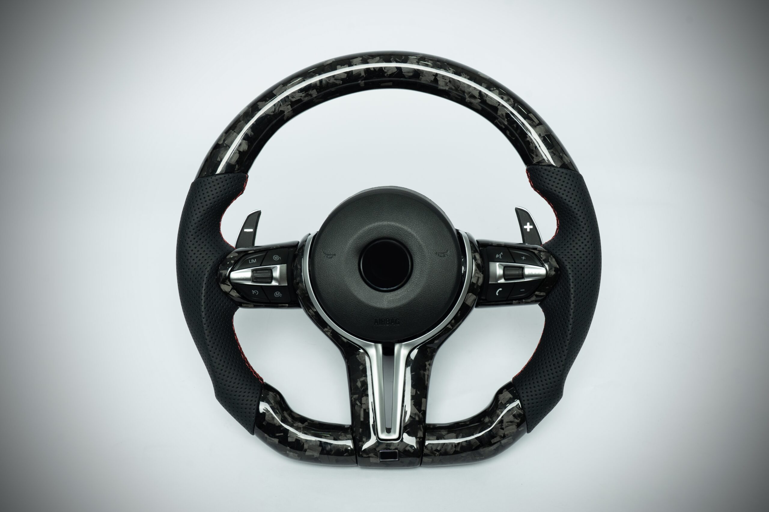 BMW F series M3/M4 suede steering wheel with carbon inner trim and red M1/M2 buttons, comes with magnetic shift paddles