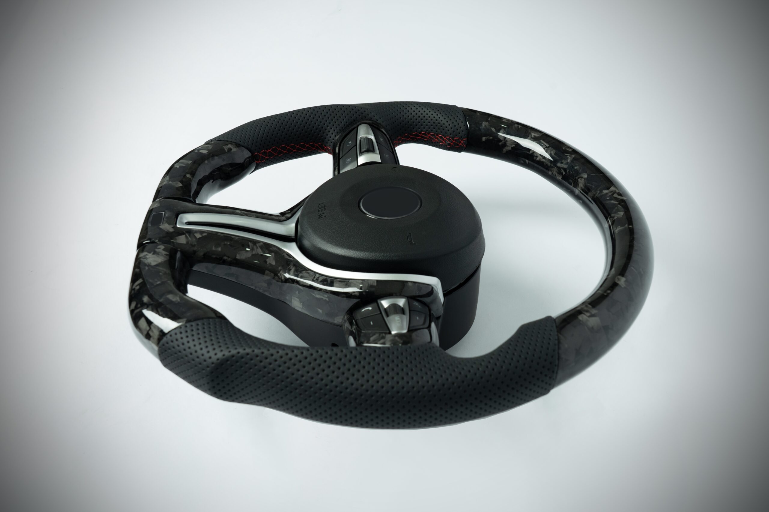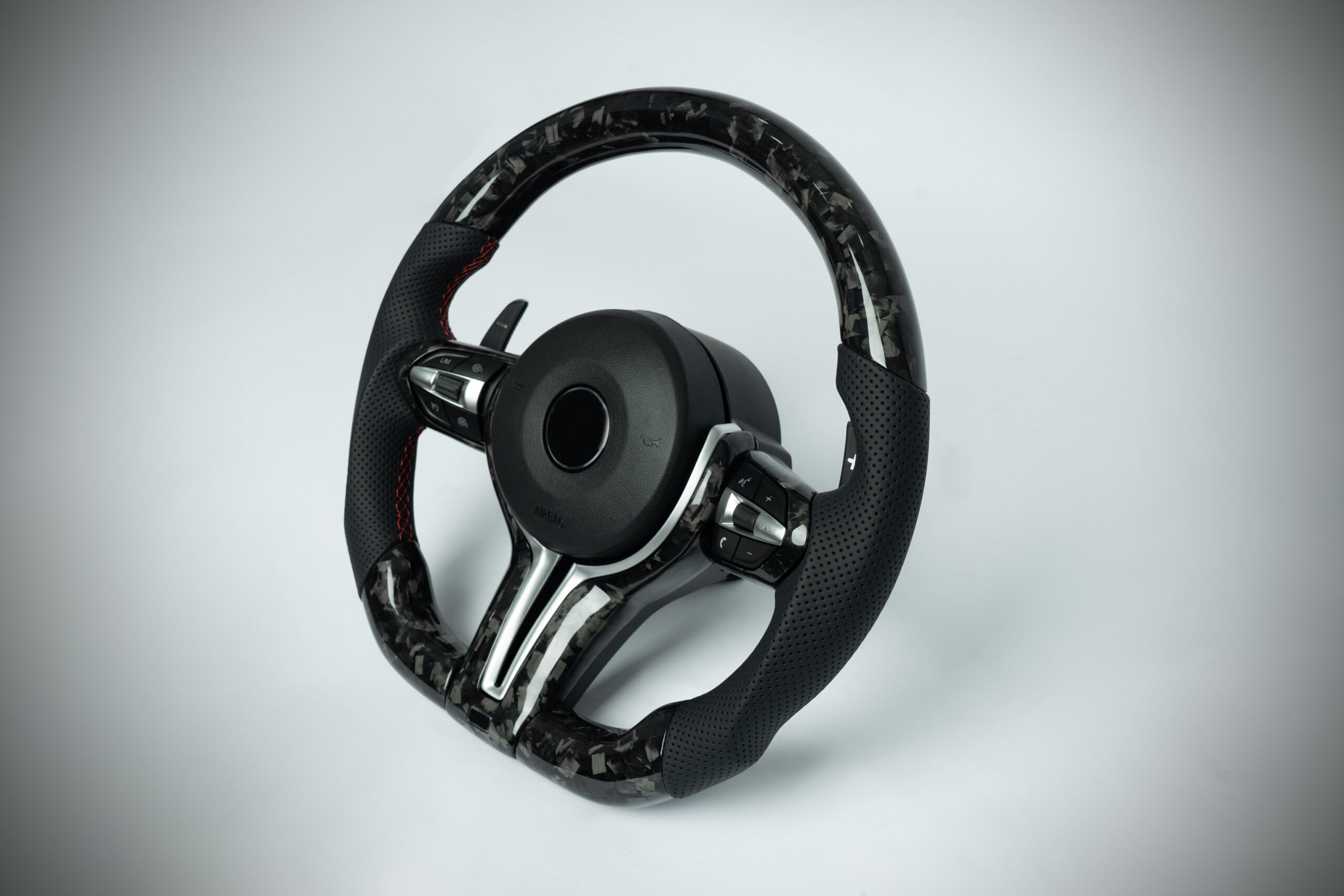 BMW F series M3/M4 flat bottom forged carbon steering wheel with silver inner trim and perforated leather grip